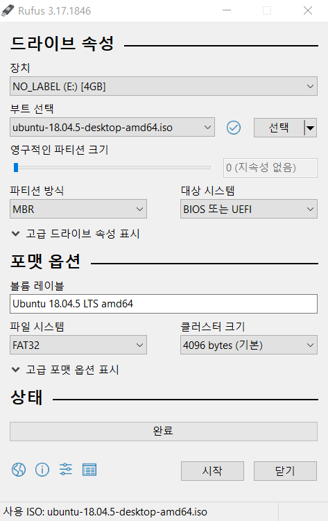 - [부트 선택] 에서 링크에서 받아둔 ubuntu-18.04-desktop-amd64.ios 선택
