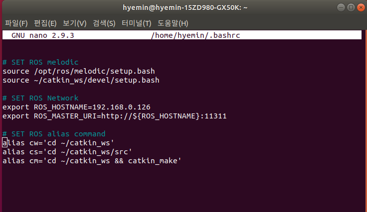 .bashrc 파일의 마지막 부분에 위의 내용을 채워 넣는다. 이때 본인의 ROS_HOSTNAME은 ifconfig를 통해 알 수 있다.